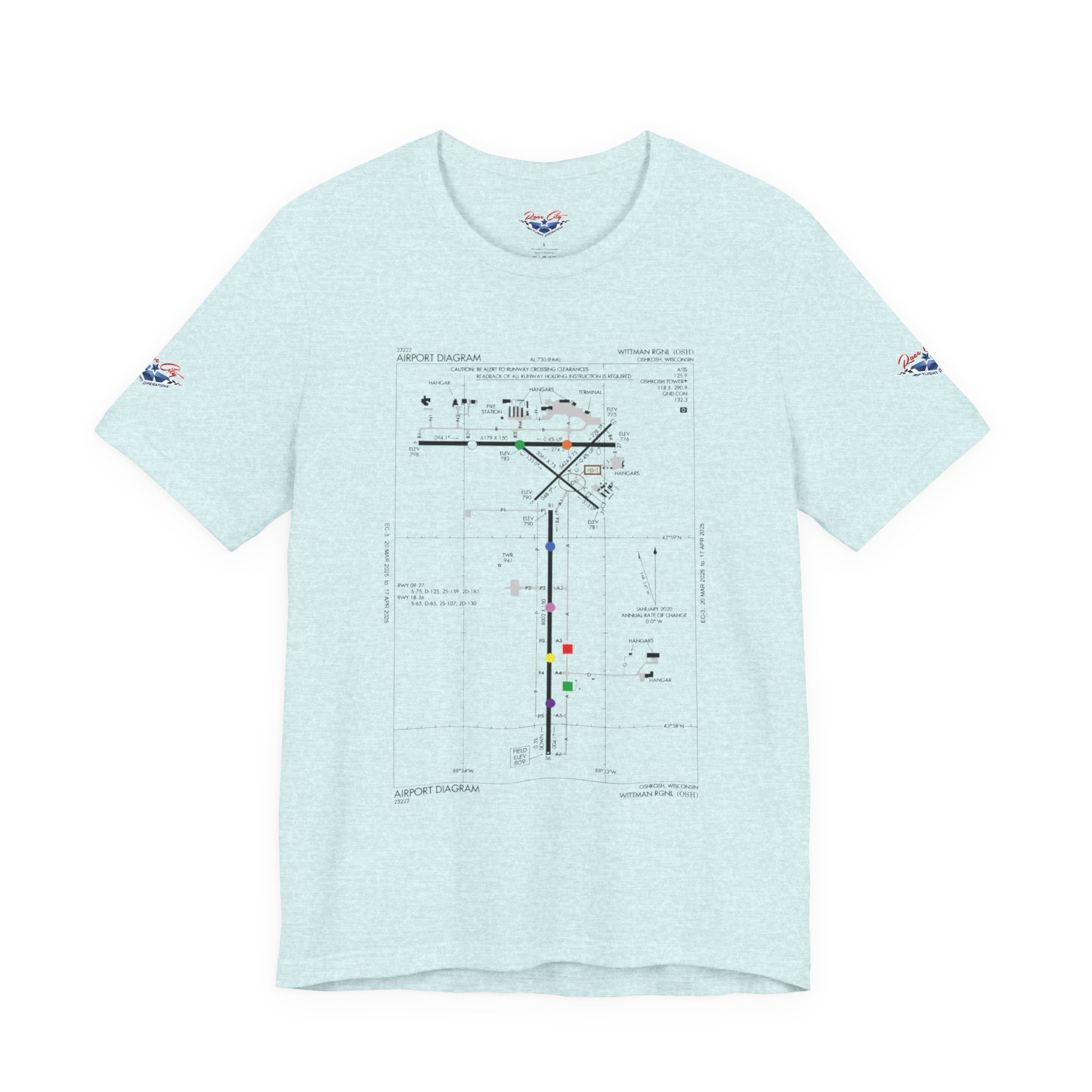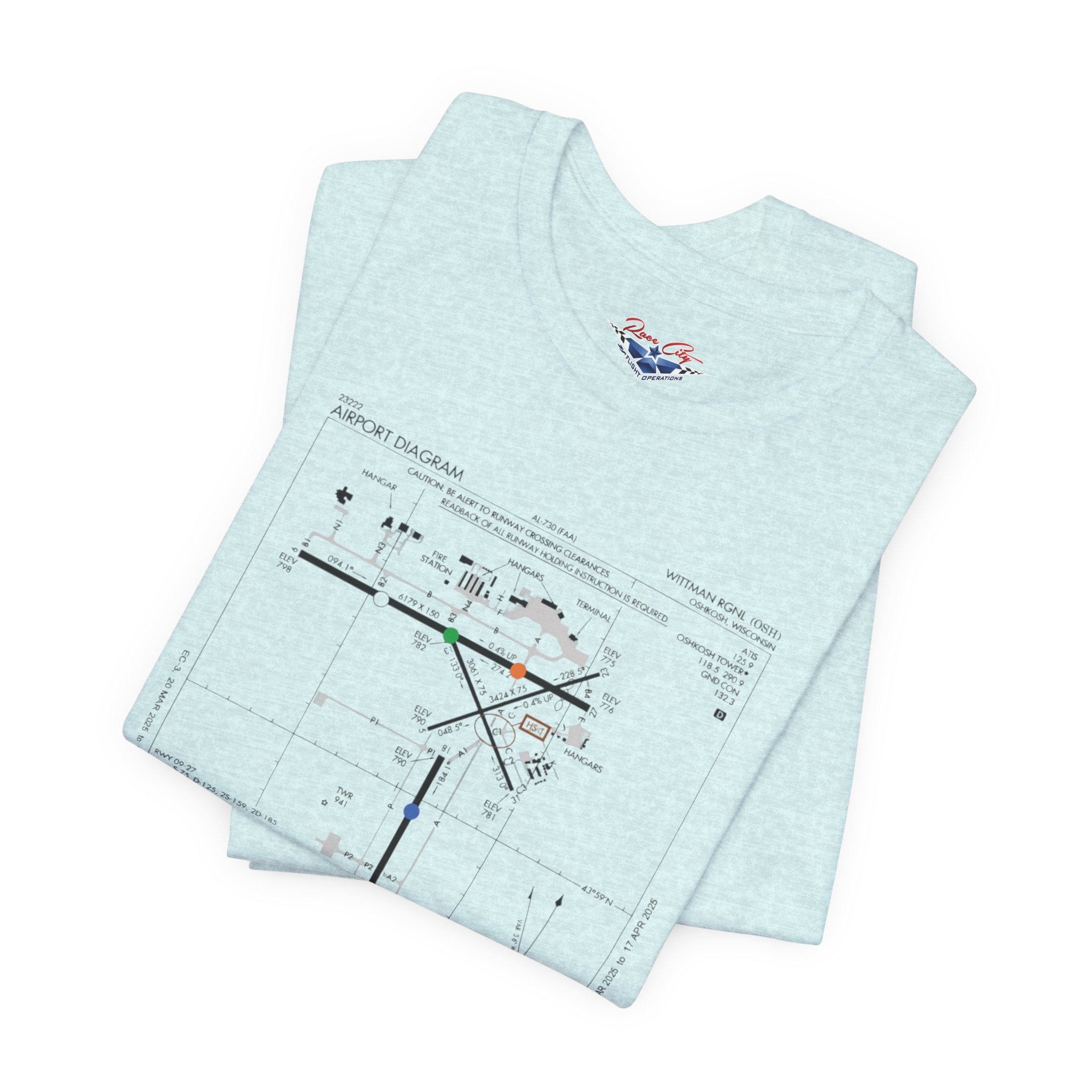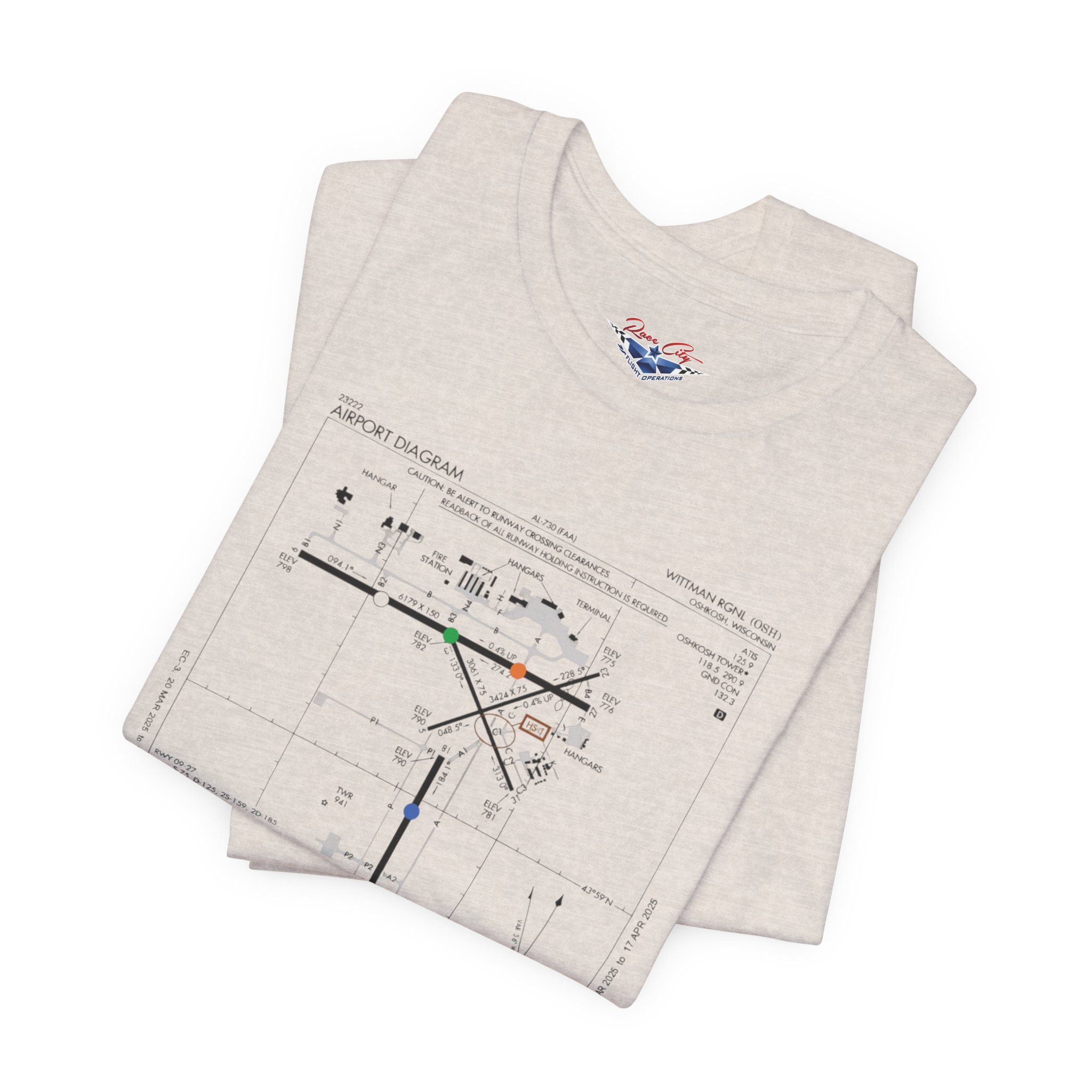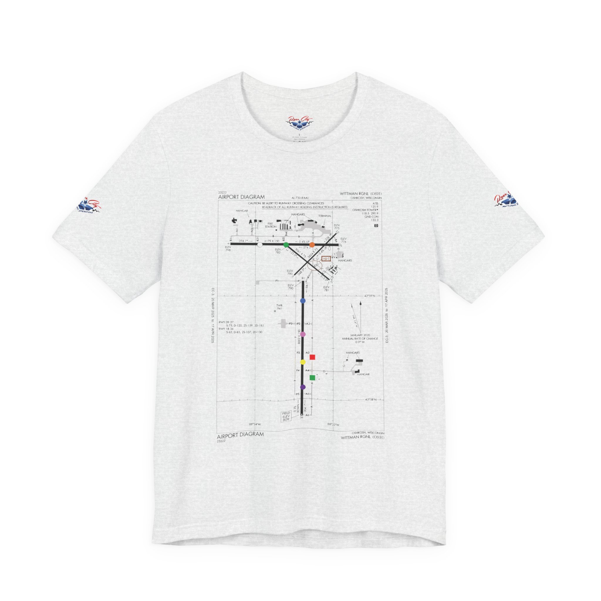 A slim, soft tee printed with an airport-diagram graphic that honors Oshkosh AirVenture’s spirit. The shirt feels light against the skin and settles into place—breathable, easy to layer, and quietly confident. Wear it to watch vintage warbirds taxi, trace the diagram with a fingertip while swapping pilot stories, or toss it on for a weekend of hangar walks and late-night debriefs. The runway lines and labeled taxiways become a small map of memory: early-morning fog lifting off the tarmac, the hum of preflight checks, and the hush that comes when a propeller comes to life. It speaks to pilots, plane-spotters, and festival regulars who collect moments in flight logs and photos rather than in shelves of tchotchkes. Subtle and technical, this tee pairs with jeans, a windbreaker, or a worn leather jacket and carries a quiet pride for AirVenture days and nights.