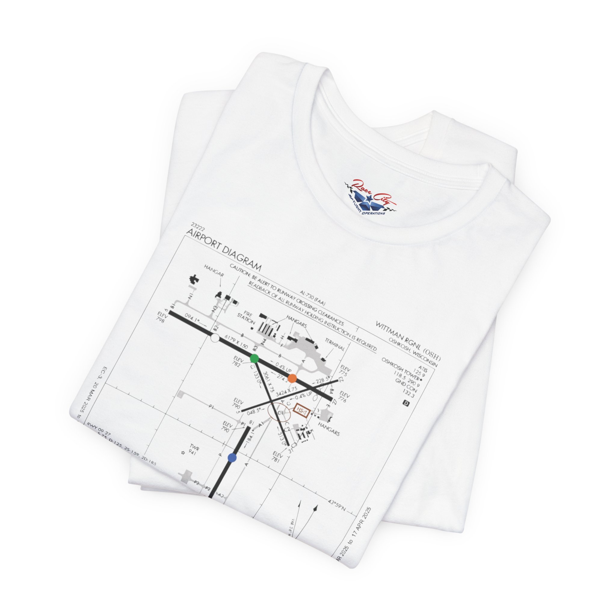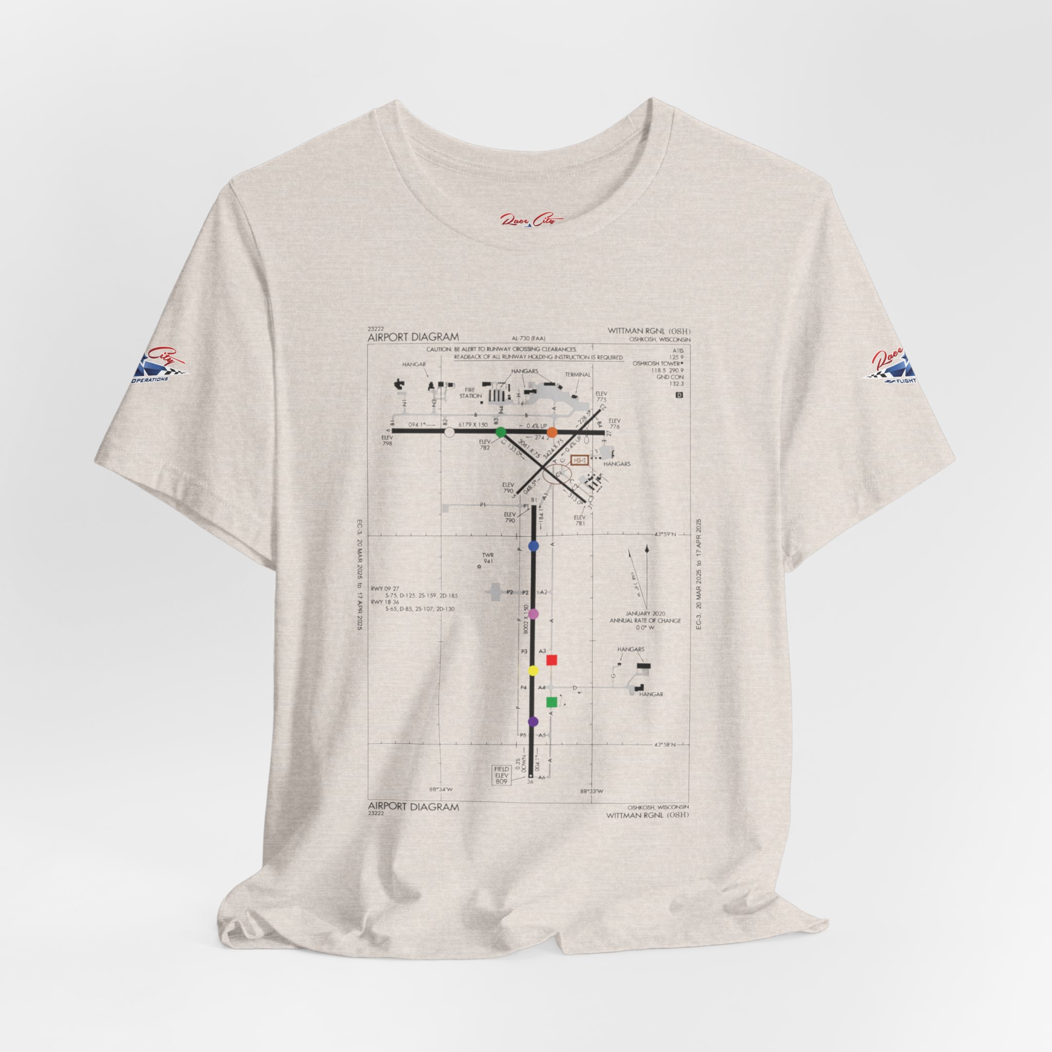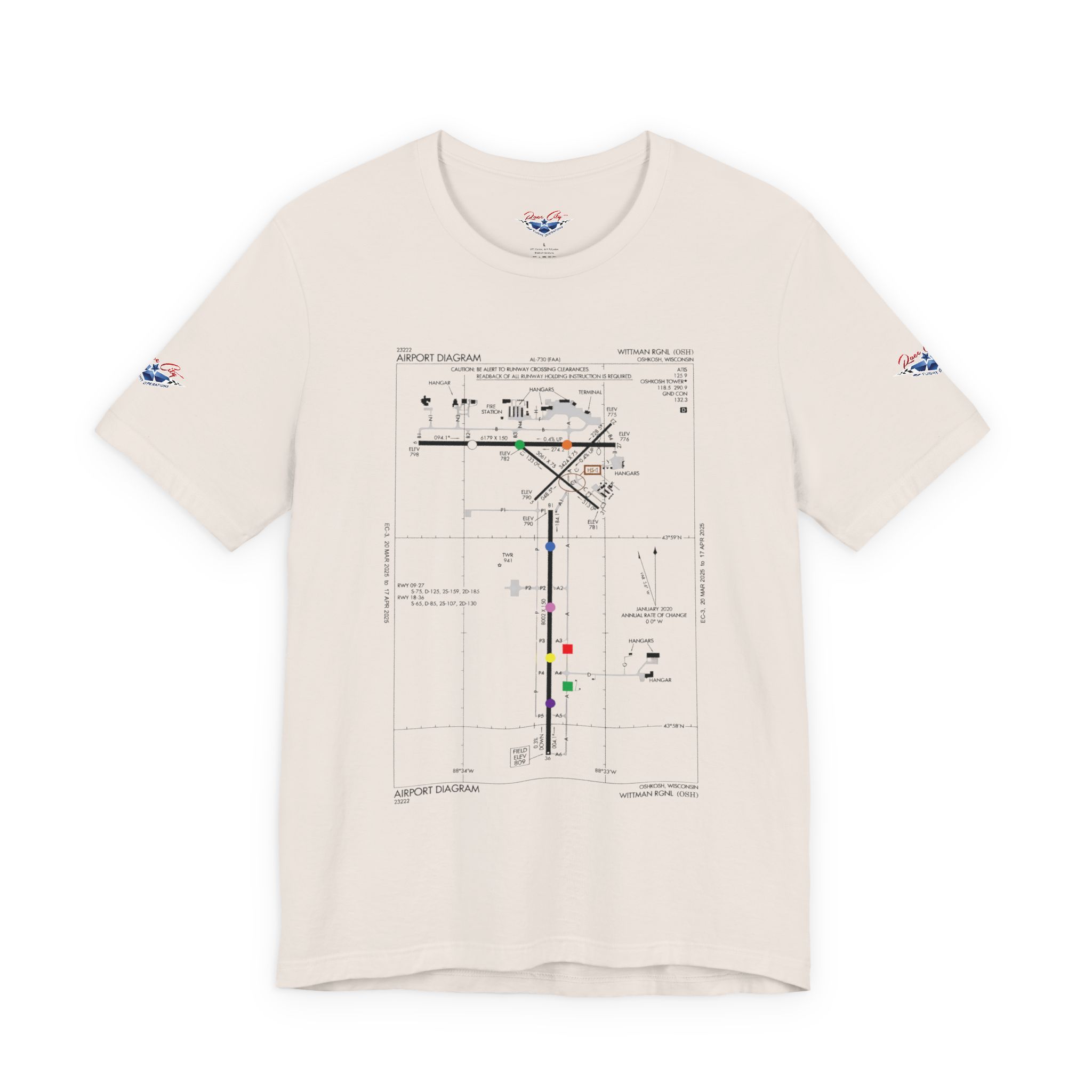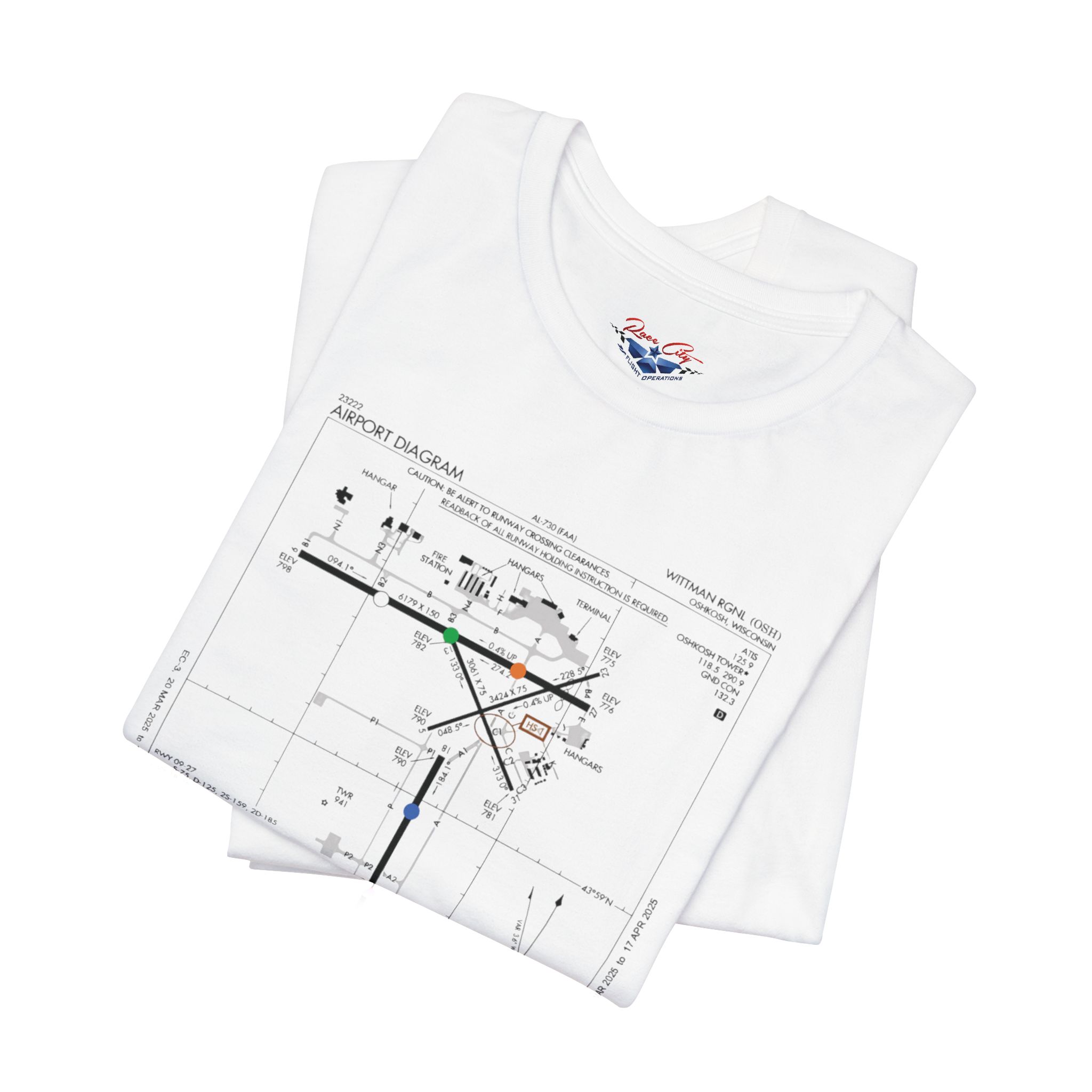 A slim, soft tee printed with an airport-diagram graphic that honors Oshkosh AirVenture’s spirit. The shirt feels light against the skin and settles into place—breathable, easy to layer, and quietly confident. Wear it to watch vintage warbirds taxi, trace the diagram with a fingertip while swapping pilot stories, or toss it on for a weekend of hangar walks and late-night debriefs. The runway lines and labeled taxiways become a small map of memory: early-morning fog lifting off the tarmac, the hum of preflight checks, and the hush that comes when a propeller comes to life. It speaks to pilots, plane-spotters, and festival regulars who collect moments in flight logs and photos rather than in shelves of tchotchkes. Subtle and technical, this tee pairs with jeans, a windbreaker, or a worn leather jacket and carries a quiet pride for AirVenture days and nights.