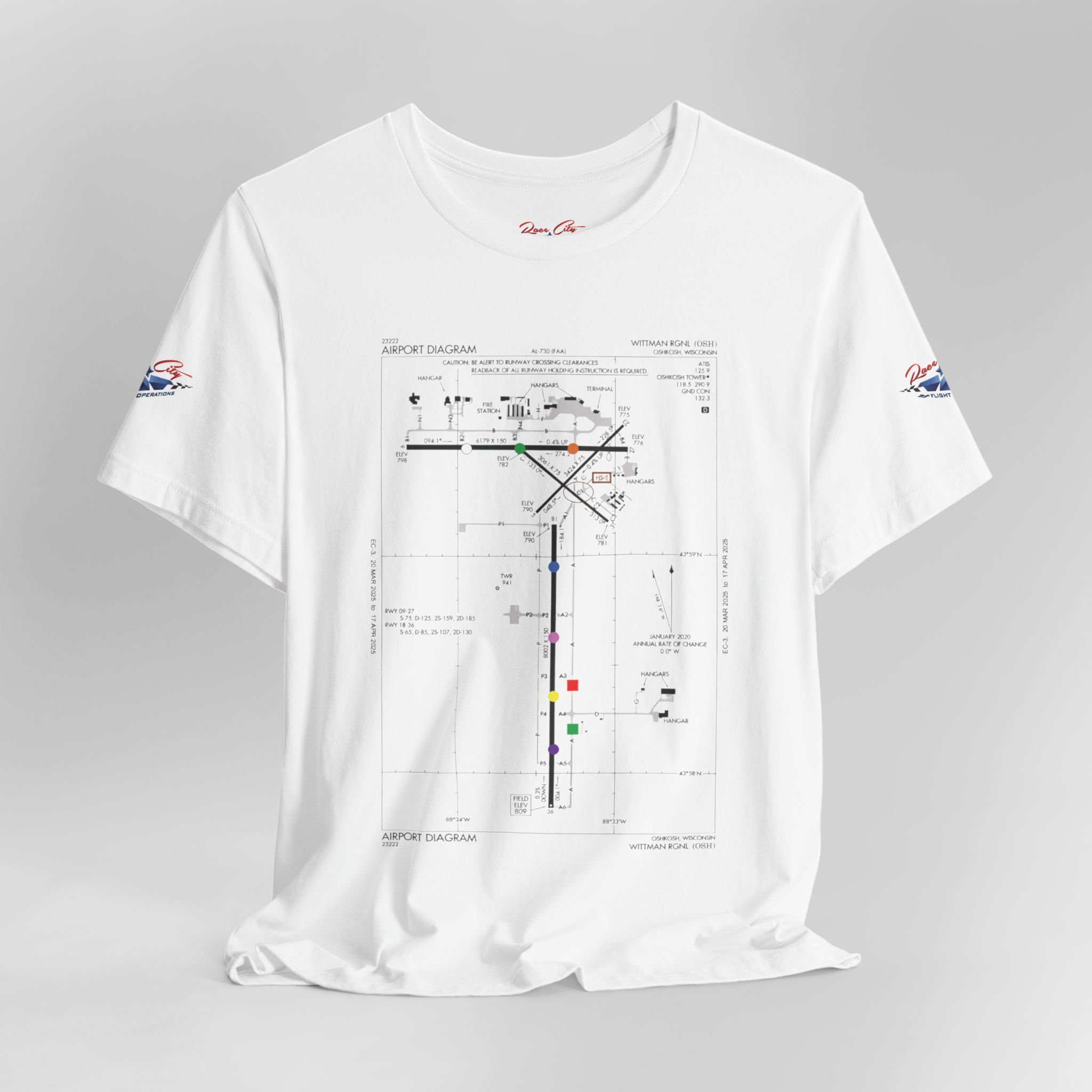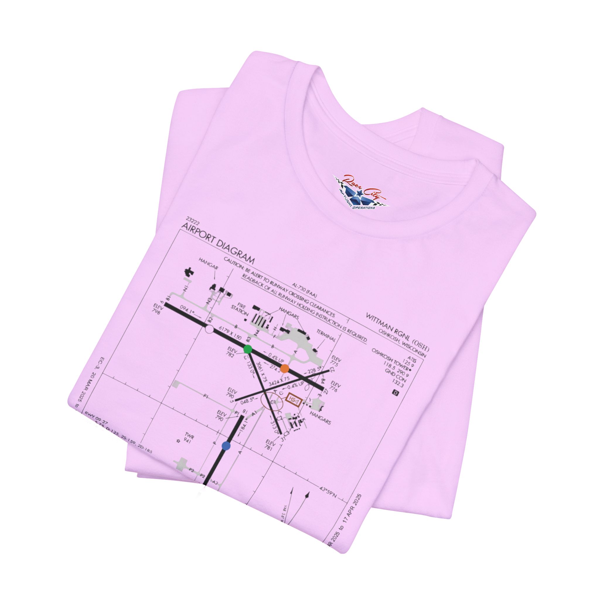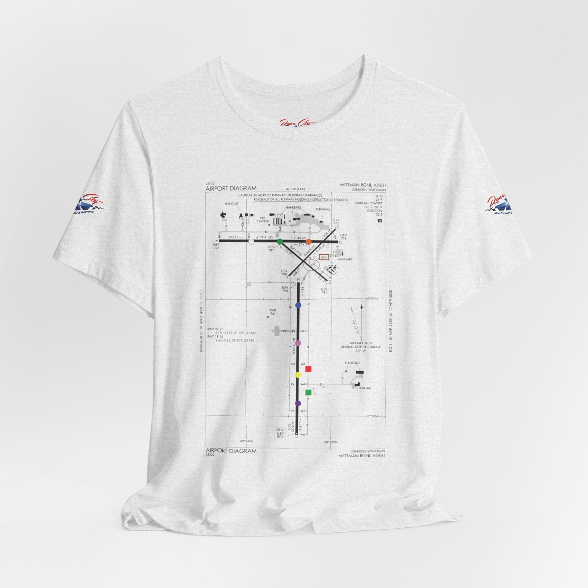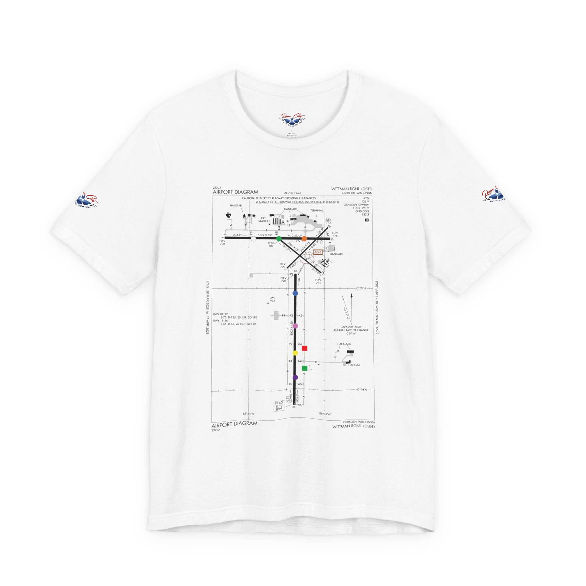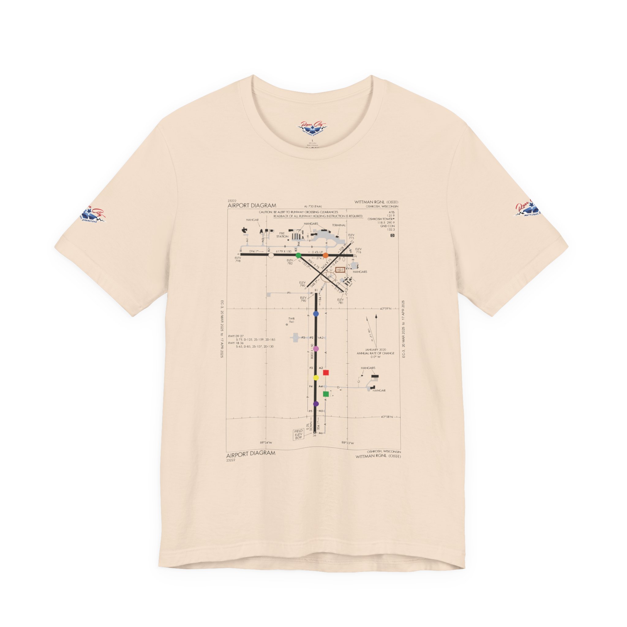 A slim, soft tee printed with an airport-diagram graphic that honors Oshkosh AirVenture’s spirit. The shirt feels light against the skin and settles into place—breathable, easy to layer, and quietly confident. Wear it to watch vintage warbirds taxi, trace the diagram with a fingertip while swapping pilot stories, or toss it on for a weekend of hangar walks and late-night debriefs. The runway lines and labeled taxiways become a small map of memory: early-morning fog lifting off the tarmac, the hum of preflight checks, and the hush that comes when a propeller comes to life. It speaks to pilots, plane-spotters, and festival regulars who collect moments in flight logs and photos rather than in shelves of tchotchkes. Subtle and technical, this tee pairs with jeans, a windbreaker, or a worn leather jacket and carries a quiet pride for AirVenture days and nights.