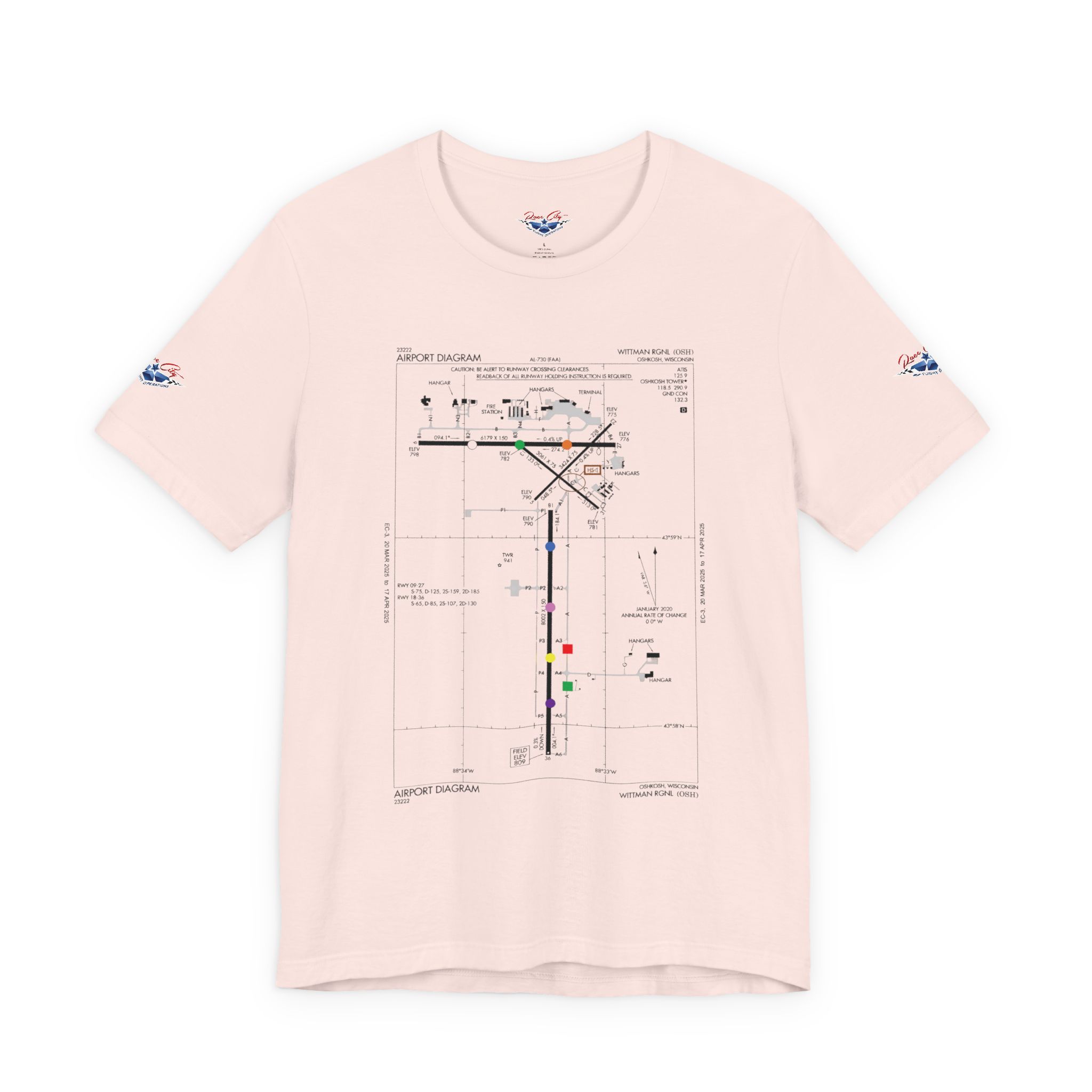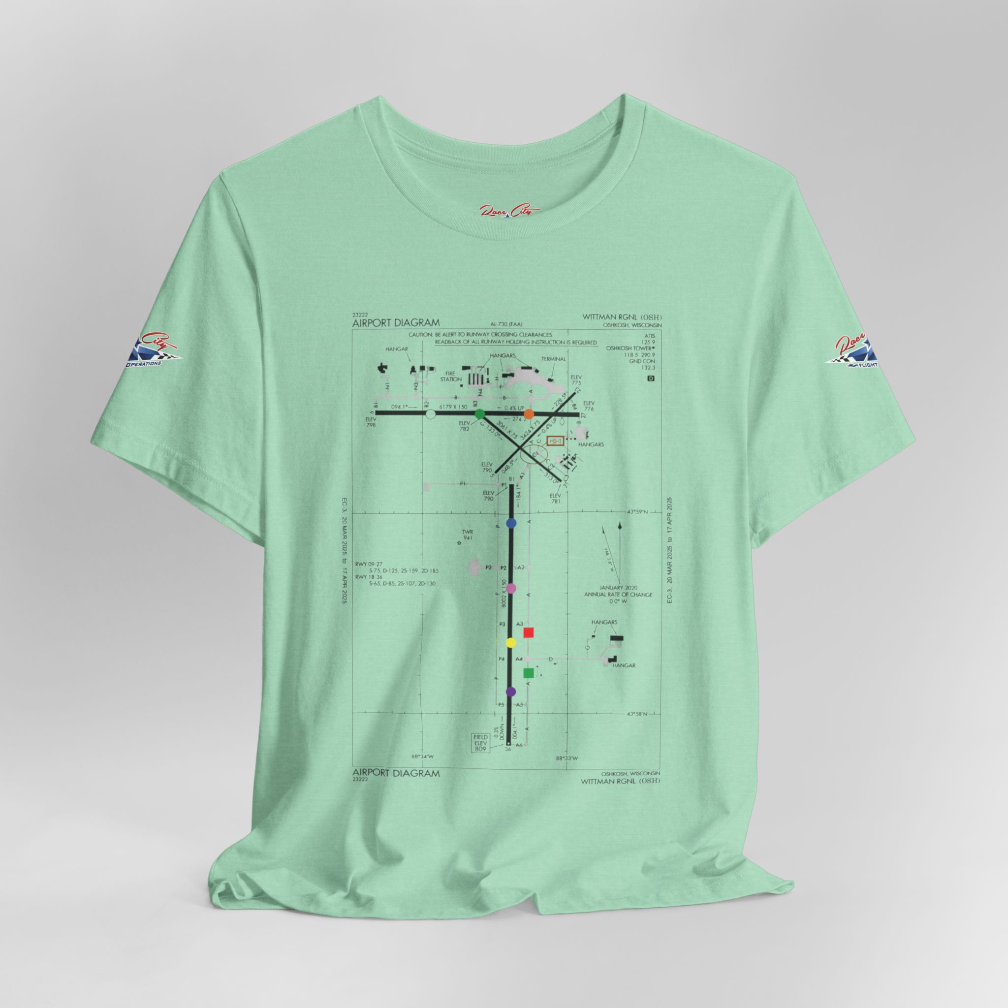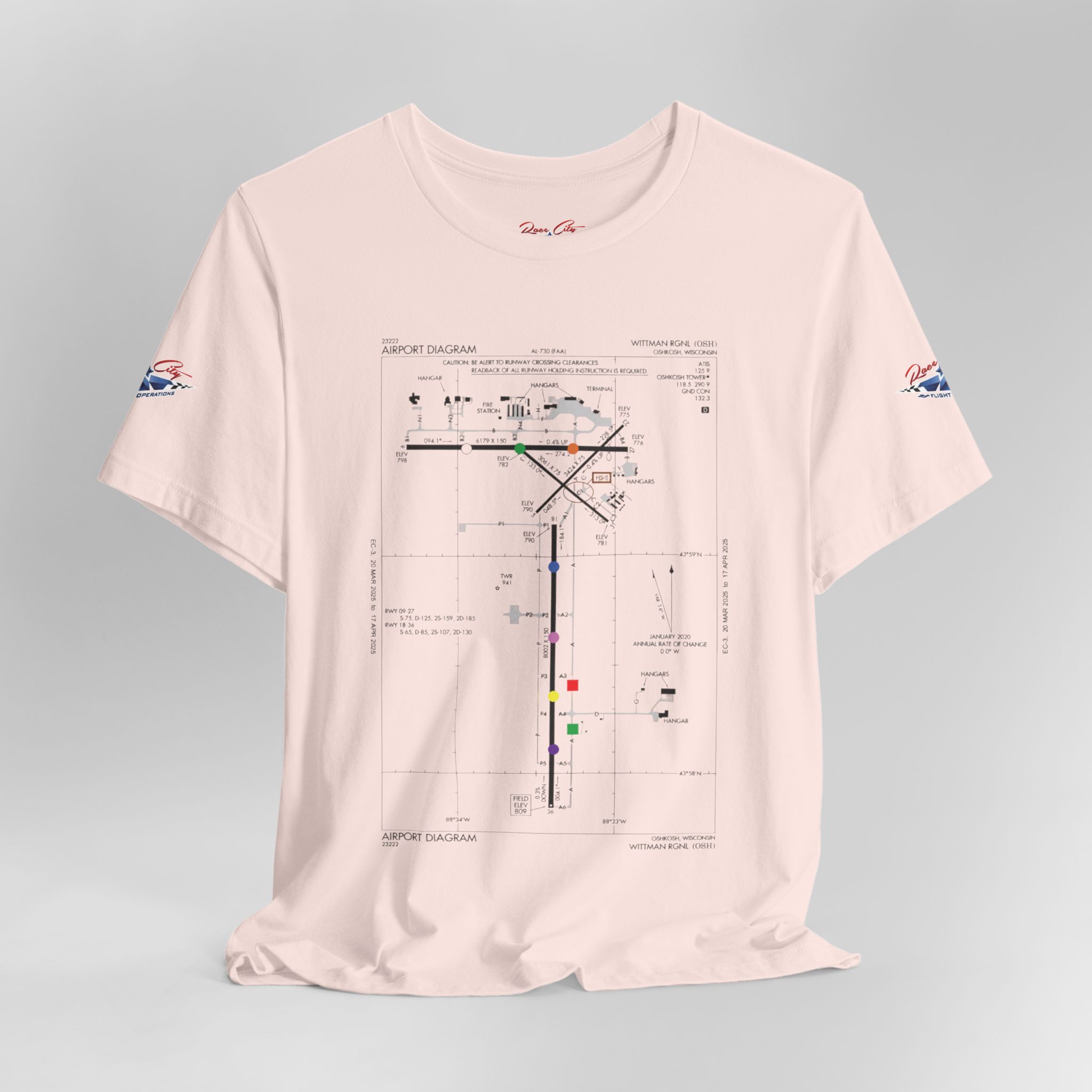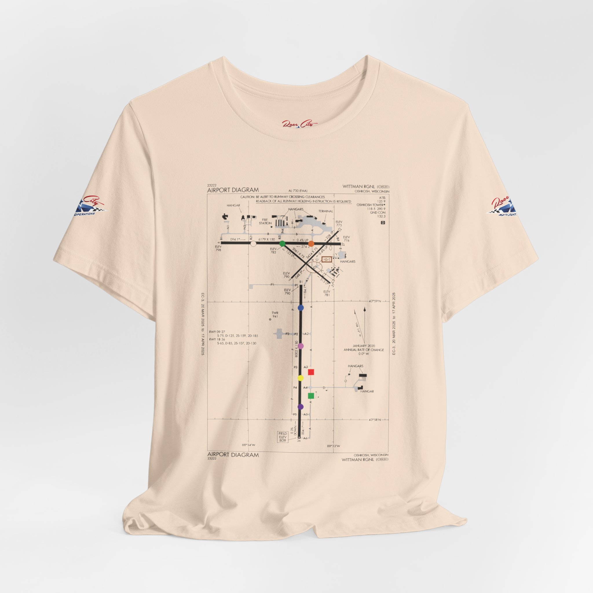 A slim, soft tee printed with an airport-diagram graphic that honors Oshkosh AirVenture’s spirit. The shirt feels light against the skin and settles into place—breathable, easy to layer, and quietly confident. Wear it to watch vintage warbirds taxi, trace the diagram with a fingertip while swapping pilot stories, or toss it on for a weekend of hangar walks and late-night debriefs. The runway lines and labeled taxiways become a small map of memory: early-morning fog lifting off the tarmac, the hum of preflight checks, and the hush that comes when a propeller comes to life. It speaks to pilots, plane-spotters, and festival regulars who collect moments in flight logs and photos rather than in shelves of tchotchkes. Subtle and technical, this tee pairs with jeans, a windbreaker, or a worn leather jacket and carries a quiet pride for AirVenture days and nights.