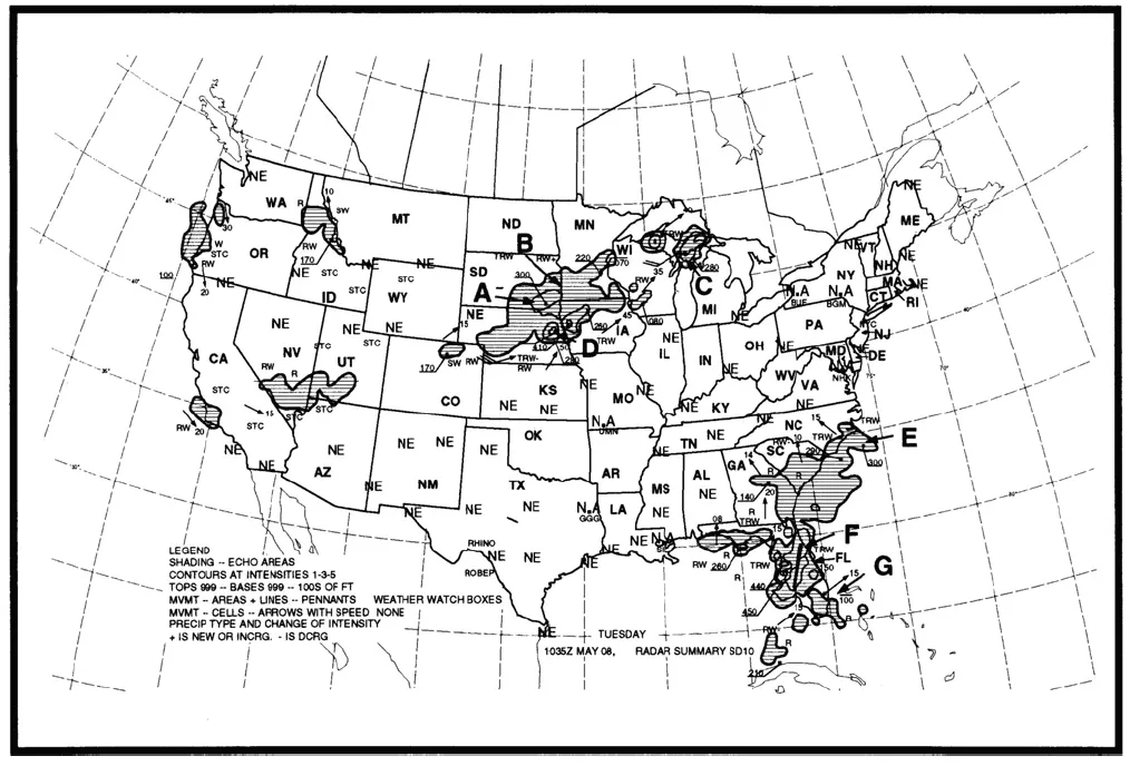What weather conditions are depicted in the area indicated by arrow G on the Radar Summary Chart?