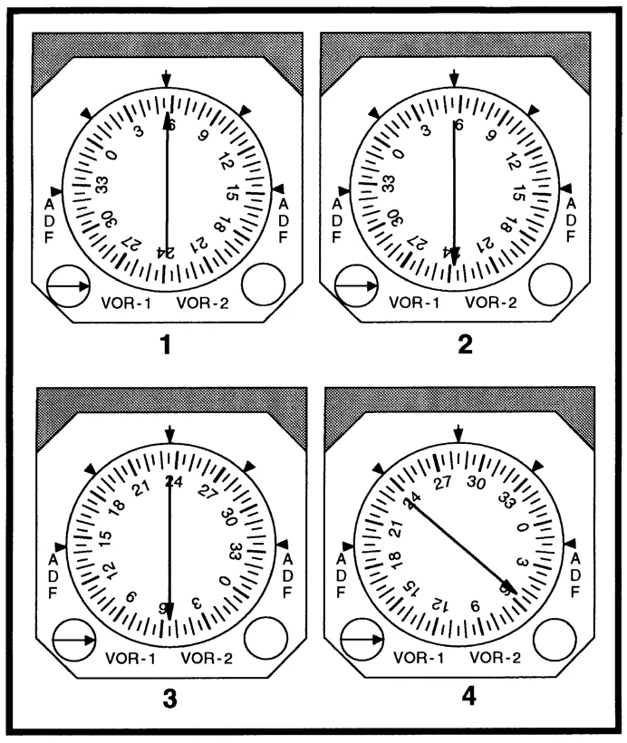 Which RMI illustration indicates the aircraft is located on the 055° radial of the station and heading away from the station?